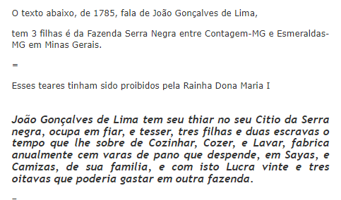 MARIA VITÓRIA DA SILVA, (filha legítima de Manoel Cardoso da Silva, e, de Maria Tereza de Jesus), casou-se com o português JOÃO GONÇALVES DE LIMA, filho legítimo de Manoel de Lima e de (Mariana) Gonçalves, em 11 de agosto de 1760, na Capela de João Mendes, na Vila de Santo Antônio do Rio Acima, Minas Gerais, (atual Rio Acima-MG).