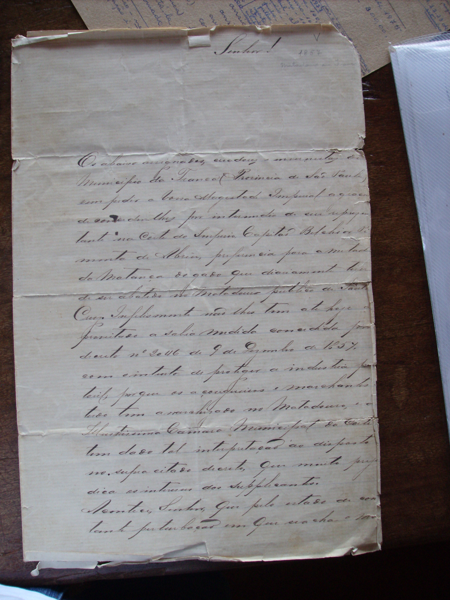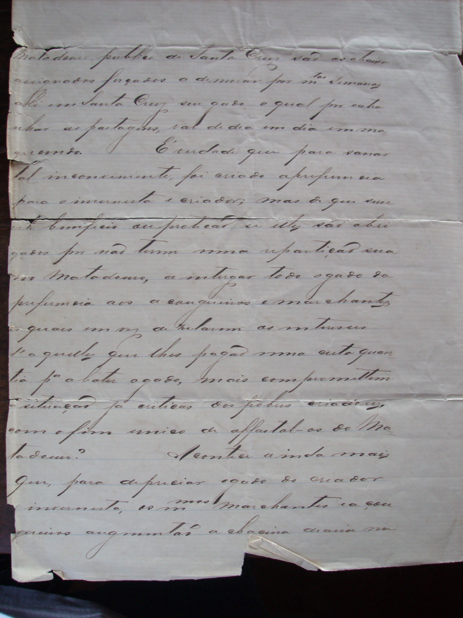 Acontece, Senhor, que pelo estado de constante perturbação em que se acha o Matadouro Público de Santa Cruz, são os abaixo-assinados forçados a demorar, por muitas semanas, aí em Santa Cruz, seu gado, o qual, por estranhar as pastagens, vai, dia a dia, emagrecendo.