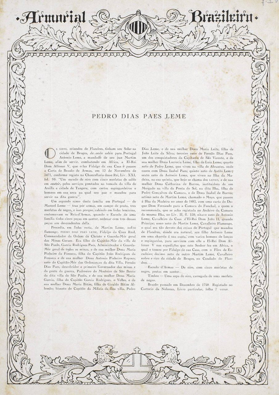 que levaram-no à certeza da existência desse 1.° casamento, o que foi por ele comunicado a frei Gaspar da Madre de Deus, além da carta de brasão de armas passada a seu descendente Pedro Dias Paes Leme, registrada em Lisboa, da qual consta que Fernando Dias Paes, casado com sua sobrinha Lucrecia Leme, foi f.º de Pedro Leme e de Isabel Paes, n. p. de Antão Leme, bisn. de Antonio Leme e de Catharina de Barros etc.