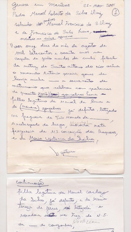 MARIA VITÓRIA DA SILVA, filha legítima de Manoel Cardoso da Silva e de Maria Tereza de Jesus, foi casada com JOÃO GONÇALVES DE LIMA, filho legítimo de Manel de Lima e (Mariana) Gonçalves, em 11 de agosto de 1760, na Capela de João Mendes, Santo Antônio do Rio Acima, Minas Gerais…..e tiveram de filha: