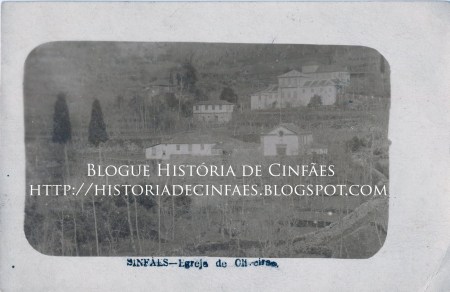 Igreja de Oliveira do Douro. Postal não circulado de uma colecção de 9 que reproduzem aspectos vários de Oliveira do Douro, finais do século XIX. Colecção particular. Atrás da pequena igreja de Oliveira (que nesta altura ainda não possuía campanário) a imponente Casa da Castanheira com os seus acrescentos e edifícios anexos. Embora suspeitemos que este postal seja anterior à implantação da República, não deixa de ser um documento valiosíssimo para o estudo da arquitectura e da própria evolução história da paisagem por terra de Cinfães, nos últimos 150 anos.