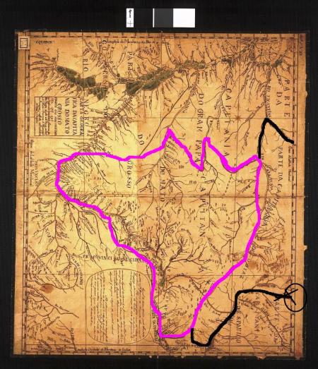 Assinalado em cor, o contorno das antigas capitanias de Goiás e Matto Grosso