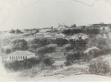 Uberaba por volta de 1885: A Casa de Câmara e Cadeia (Prefeitura) e Hotel do Comércio. Na Rua Municipal, atual Rua Manuel Borges, à direita da Prefeitura, os sobrados da Tia Tarquilina e Tia Lizarda, onde nossa família Bernardes da Silveira morou por décadas, desde os anos 1820. Bem no canto direito da foto, em cima, o sobrado que Vovô Cunha Peixoto médico ganhou por curar uma mulher. Do Sobrado do Vovô Cunha, na Rua São Sebastião com Major Eustáquio, descia-se o Beco da Maçonaria até chegar a atual Rua Manuel Borges.