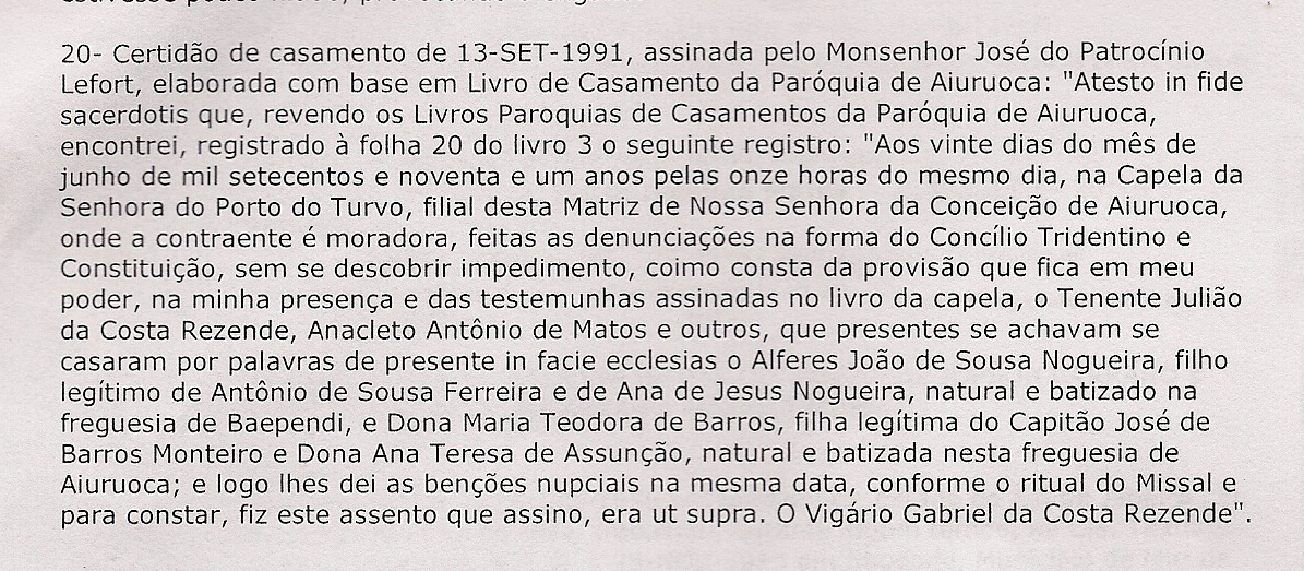 tri-neta: Maria Teodora (Nogueira) do Nascimento (bat. 30-abr-1826, Andrelândia-MG) que foi mãe de:
