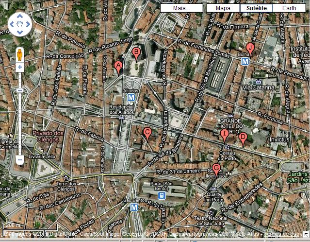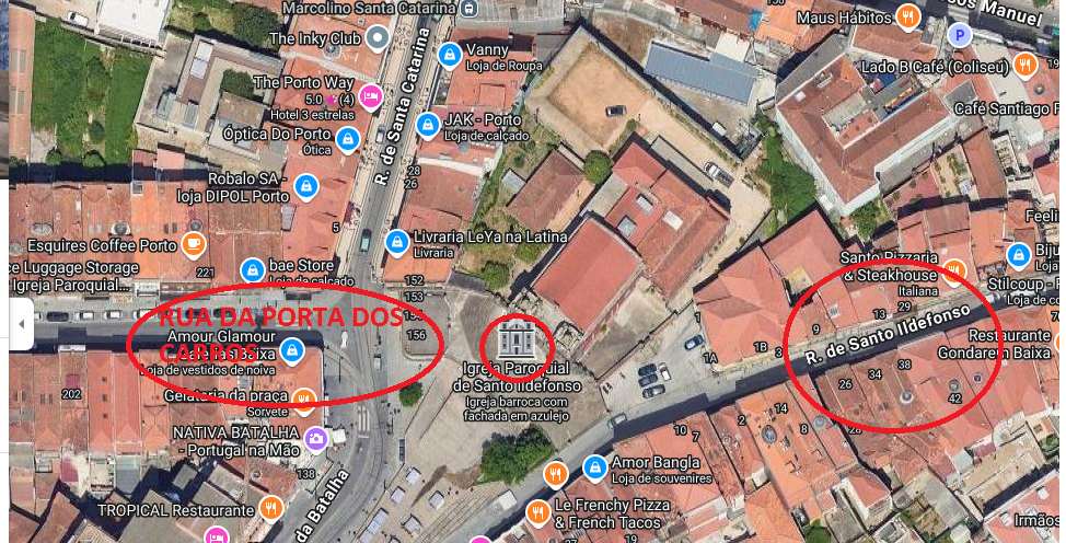 Mapa da região da Freguesia de Santo Ildefonso, a  Rua Direita em que nasceu o vovô Cunha Peixoto é hoje rua de Santo Ildefonso, perto da rua 31 de janeiro, Porta dos Carros, onde nasceu sua mãe Tereza Albina.:
