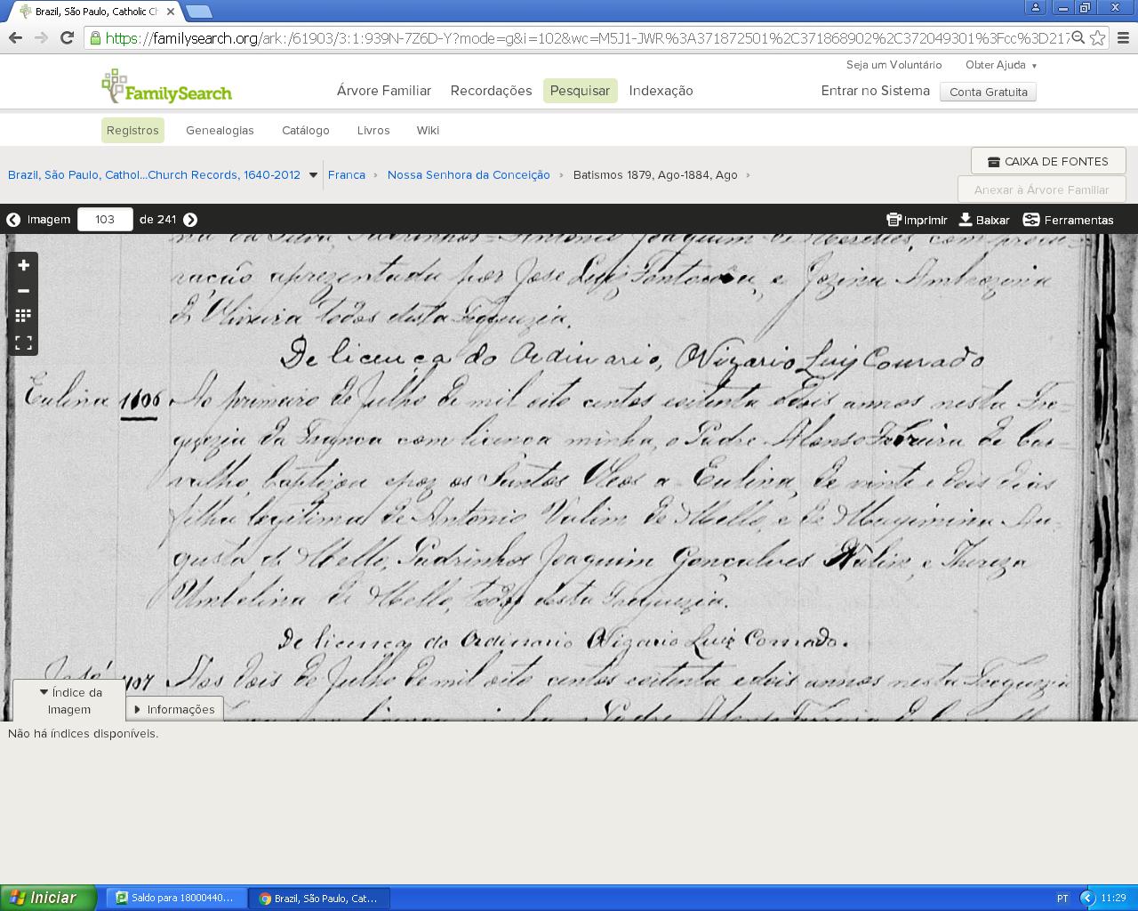 Aqui o assento de batizado de Eulina em Franca-SP. Seus pais se casaram em 1881, e, em 10 de junho de 1882, nasceu a filha mais velha Eulina.