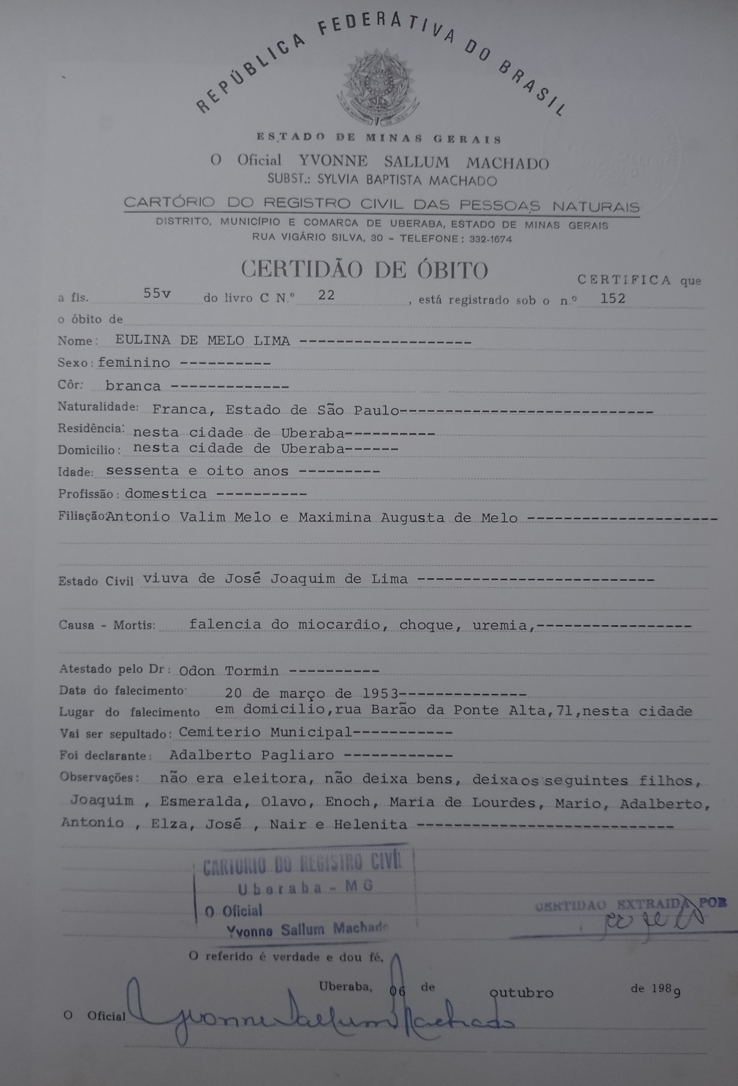 JOSE JOAQUIM DE LIMA que nasceu em UBERABA-MG, em 16 de agosto de 1884, e casou-se, em 10 de junho de 1902, com Eulina Augusta de Melo  (SOLINA) e teve 13 filhos. Casaram-se no dia do aniversário de Eulina( chamada de Solina), nascida em Franca-SP.