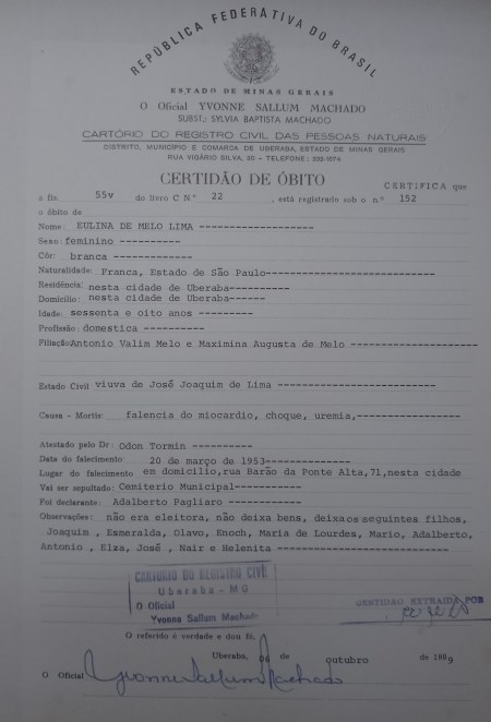 0 0 Eulina Augusta de Melo Lima, e, José Joaquim de Lima, e, seus 69 netos, Melo Lima, Souza Lima, de Uberaba-MG, no Brasil – Dois irmãos vindos de Ponte de Lima em Portugal – Tereza Euzébia, filha do Capitão Domingos, e, o seu marido Vovô Cunha Peixoto Leal, natural da Freguesia de Santo Ildefonso, na Leal Cidade do Porto, Portugal, em Uberaba-MG no Brasil, os seus netos se casaram nas famílias: Figueiredo, Ferreira, Frizzo, Melo Lima, Carrilho de Castro, Genari, Cunha, Prata, Coli, e nos Valim de Melo